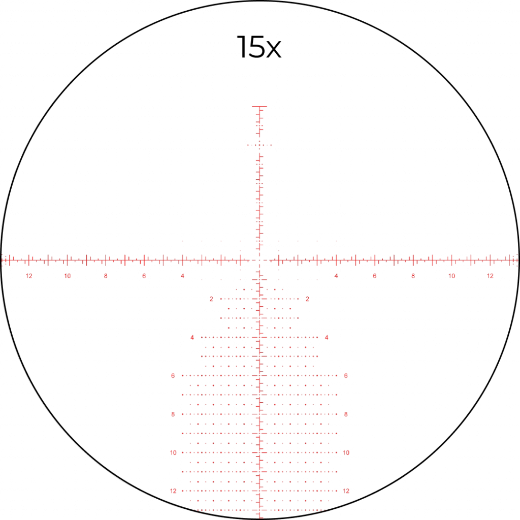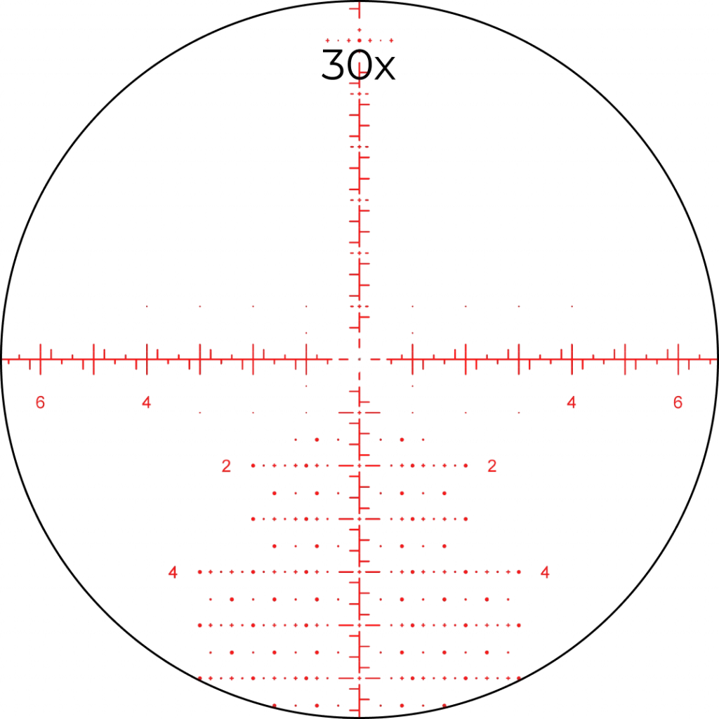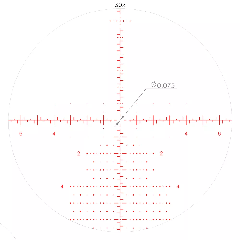 Прицельная сетка AM530 расположена в первой фокальной плоскости (FFP) и изменяет свой масштаб согласно установленной кратности. T — образное перекрестие не препятствует обзору и позволяет быстро захватить цель на минимальной кратности 5х. Выставив увеличение в диапазоне от 15х до 30х, стрелок получает возможность оперативно вносить поправки с помощью информативной разметке по горизонтали и вертикальной «елочки».