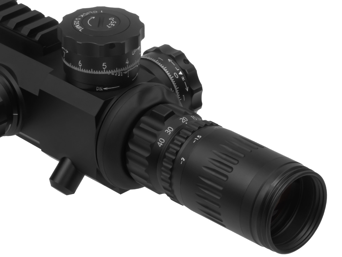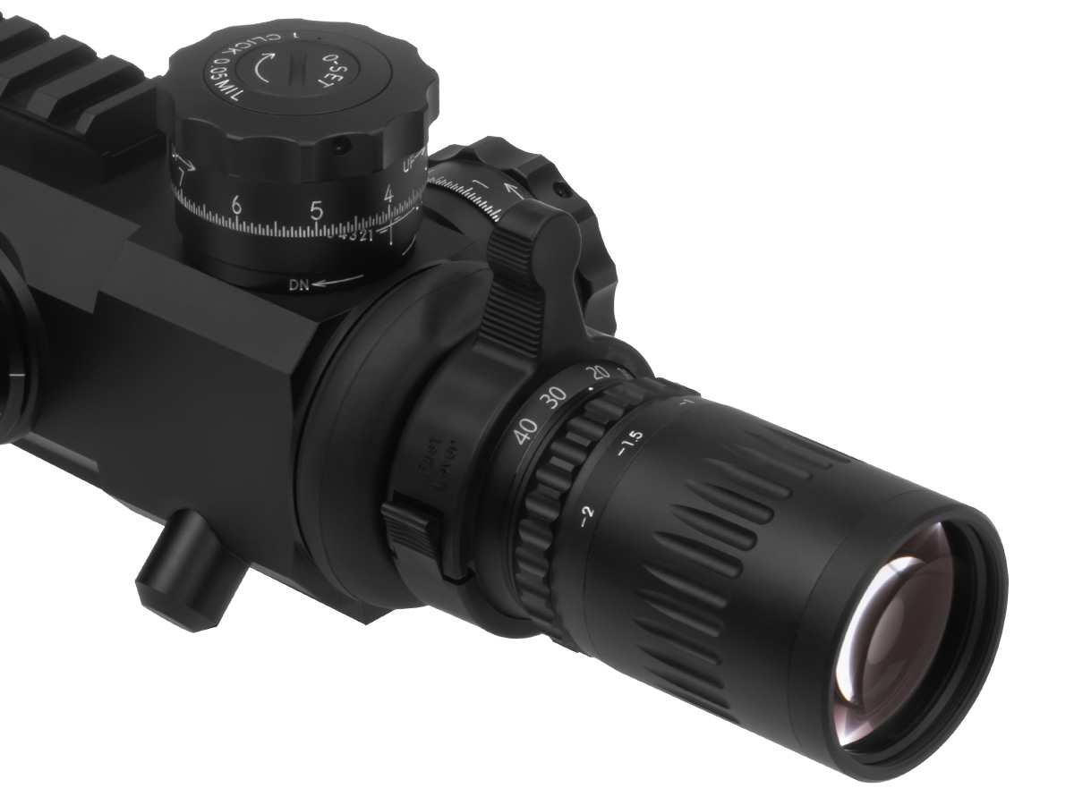 Специальная конструкция сетки позволяет быстро обнаружить цель как при малом, так и при большом увеличении. Сетка прицела FML-TR1, расположенная в первой фокальной плоскости (FFP), с увеличением кратности пропорционально изменяется. При этом угловые размеры прицельной сетки остаются одинаковыми при любых изменениях кратности. Механизм регулировки диоптрий был усовершенствован, так что теперь вы можете подстраивать окуляр под свой глаз быстрее, чем когда-либо прежде.