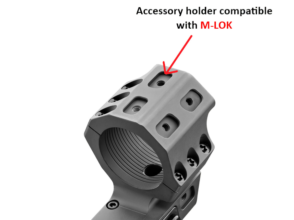 Кронштейн Ultra Tactical оснащён жидкостным уровнем для предотвращения заваливания оружия. Также, реализовано множество слотов M-LOK для крепления дополнительных аксессуаров: кронштейнов для коллиматора, дополнительных планок Picatinny (PHUTH20 или PHUTH10 — опция, приобретаются отдельно).
