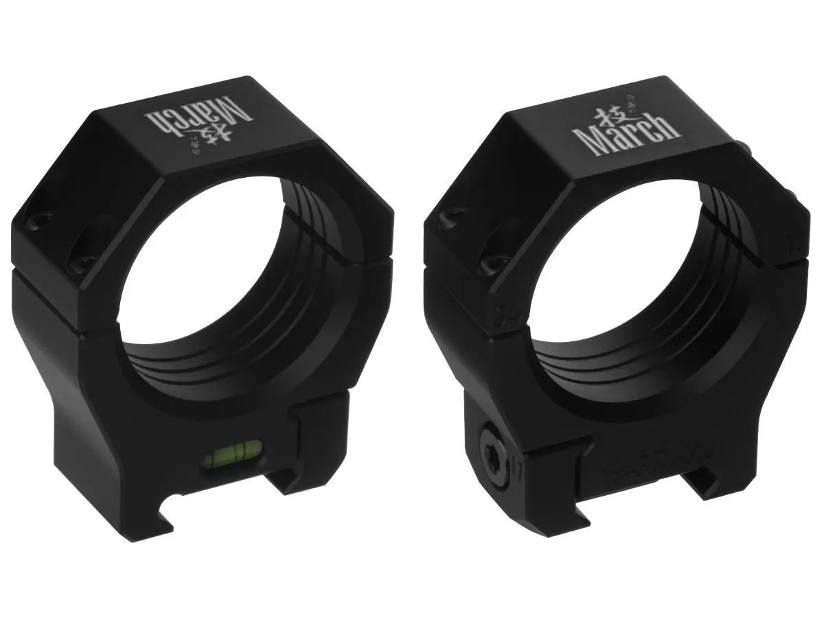 Кольца устанавливаются на планку Picatinny. Изготовлены из высокопрочного алюминиевого сплава 7075 с матовым чёрным анодированием третьего типа (MIL-A-8625 TYPE 3). В одно из колец установлен пузырьковый уровень для повышения точности стрельбы. Сверху колец расположен логотип компании March.
