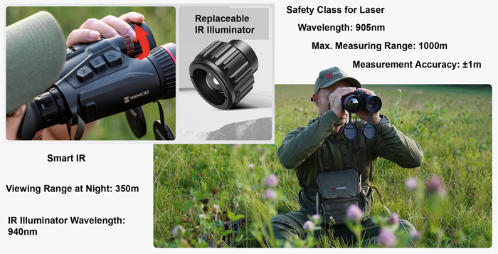 Прибор оборудован лазерным дальномером с длиной волны 905 нм, который поддерживает точные измерения расстояний. Лазерный дальномер безопасен для глаз (классу 1). Максимальная дистанция измерений составляет 1000 м при точности ±1 м. Диапазон измерений начинается с 10 м, что делает дальномер полезным как для ближних, так и дальних расстояний. Для ночного наблюдения прибор оснащен инфракрасной подсветкой с длиной волны 940 нм, которая невидима для человека и не привлекает внимания в темноте. Подсветка эффективно работает на дистанции до 350 м, обеспечивая классическую черно-белую ночную картинку. Функция Smart IR автоматически регулирует интенсивность подсветки в зависимости от расстояния до объекта, подстраивая оптимальное освещение. Возможность установки сменного ИК-осветителя позволяет адаптировать прибор под конкретные задачи.