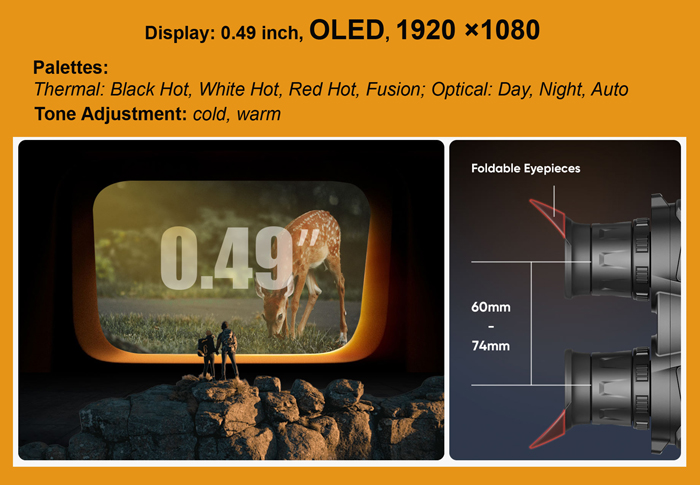 OLED-дисплей разрешением 1920x1080 пикселей обеспечивает высокую четкость и контрастность изображения. Яркость и контрастность экрана могут быть настроены вручную для оптимального восприятия в любых условиях освещения. В модели доступны различные режимы сцены (cold, warm), что позволяет выбрать наиболее подходящий для конкретных условий. Для тепловизионного режима здесь есть цветовые палитры: black hot, white hot, red hot и fusion. В оптическом режиме бинокль предлагает настройки день, ночь, авто. Для улучшения качества картинки прибор поддерживает FFC (Flat Field Correction) — функцию коррекции изображения, которая может быть автоматической, ручной или активируемой внешне. Диаметр выходного зрачка 8 мм, его вынос 15 мм, а также возможность регулировки межзрачкового расстояния в диапазоне 60-74 мм, позволяют разным пользователям эффективно работать с устройством. Диоптрийная настройка в пределах -5 до +3 диоптрий дает возможность адаптировать прибор под зрение пользователя без использования очков.