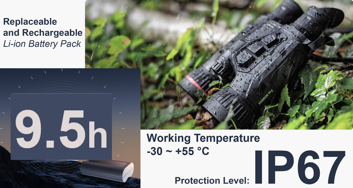 Для функционирования бинокля используется сменный литий-ионный аккумулятор, который обеспечивает до 9.5 часов автономной работы без подзарядки. При необходимости можно подключить внешний источник питания через разъем USB Type-C. Корпус прибора защищен по стандарту IP67, что обеспечивает его полную пыле- и водонепроницаемость, позволяя использовать бинокль HikMicro Habrok Pro HX60LN в суровых условиях. Температурный диапазон эксплуатации устройства от -30 до +55 °C позволяет использовать его в самых экстремальных погодных условиях. Для крепления предусмотрен стандартный адаптер 1/4“-20-UNC, что обеспечивает совместимость с различными штативами и аксессуарами.