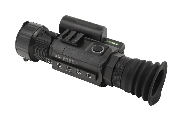 ATAK ET23-45LRF PRO (4,7x, F45 мм) — тепловизионный прицел для ночной охоты на средних и дальних дистанциях. Помогает видеть дальше в условиях ограниченной видимости (туман, снег, темнота). Может обнаружить цель 1,7x0,5 в пределах 1700 м. Способен записывать видео, измерять расстояние и считать поправку на дальность. Стабильно держит отдачу популярных охотничьих калибров вроде .308 Win.